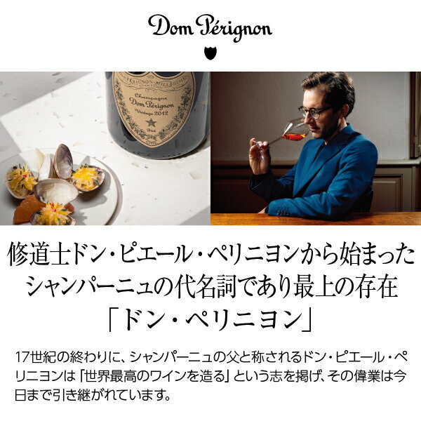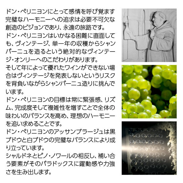 ITEM INFORMATION 言葉では言い表せない魅力 Dom PerignonVintage ドン ペリニヨンヴィンテージ ドン・ペリニヨン ヴィンテージは、セラーで7年間を過ごし、最高のコクと深みの 極みに達しました。
