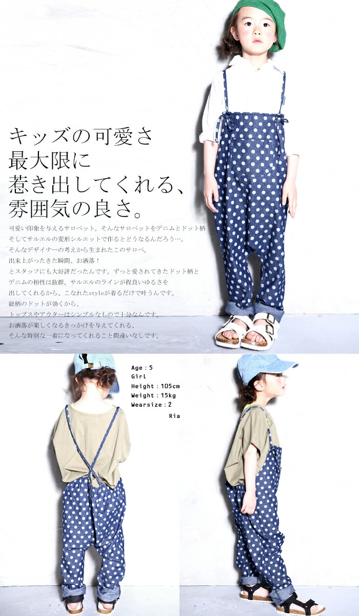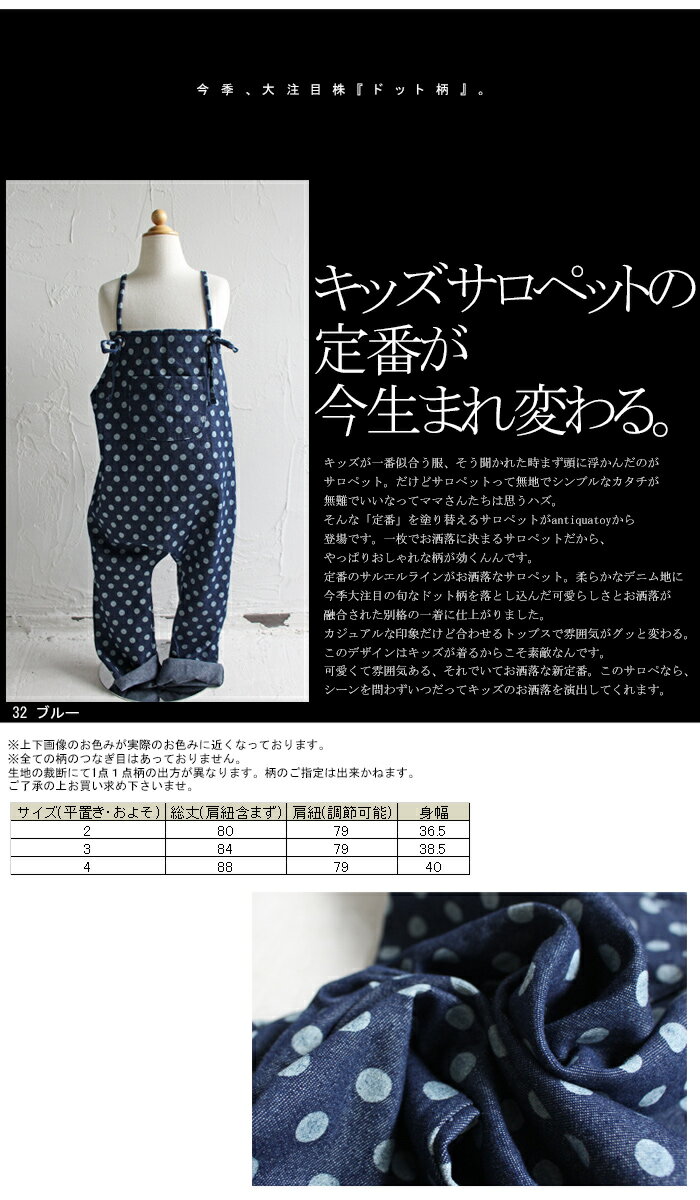 ドットデニムサロペット サイズ 2、3、4 素材 綿100% 生地の伸縮性 伸縮性なし 生地の透け感 透けません 配送方法 ◎メール便可! ※サイズ表記について サイズ(平置き・およそ) 総丈(肩紐含まず) 肩紐(調節可能) 身幅 2 80 79 36.5 3 84 79 38.5 4 88 79 40 サンプルサイズ モデルちゃんサイズは画像をご確認下さい。
