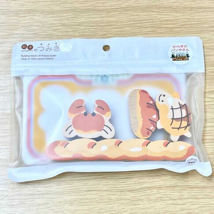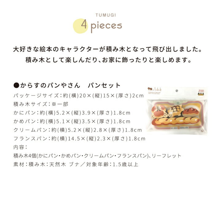 パッケージサイズ 約(横)20×(縦)15×(厚さ)2cm 積み木サイズ かにパン:約(横)5.2×(縦)3.9×(厚さ)1.8cm かめパン:約(横)5.1×(縦)3.5×(厚さ)1.8cm クリームパン:約(横)5.2×(縦)2.8×(厚さ)1.8cm フランスパン:約(横)14.5×(縦)2.3×(厚さ)1.8cm 内容 積み木4個(かにパン・かめパン・ クリームパン・フランスパン)、リーフレット 素材 積み木:天然木 ブナ 対象年齢 1.5歳以上 「絵本のつみき」は、積み木遊び、ごっこ遊び、知育遊びと、 成長に合わせた遊びと学びが得られます。