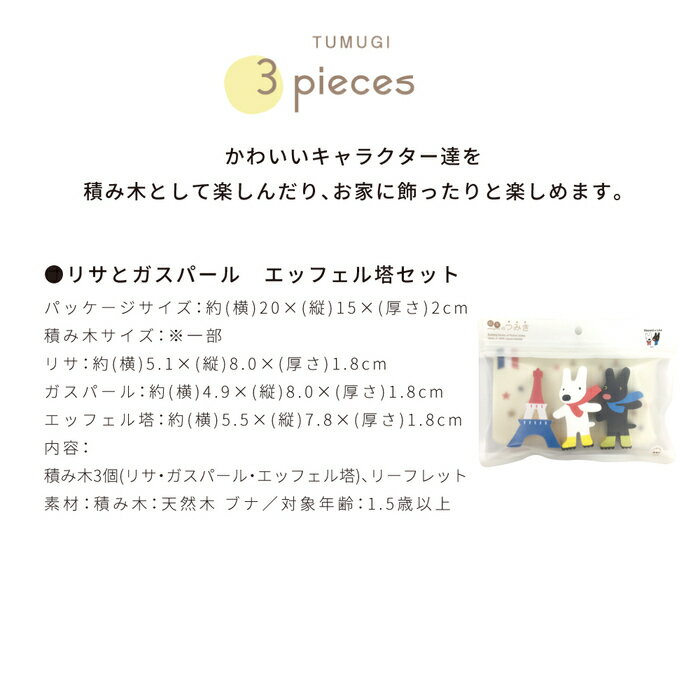 パッケージサイズ 約(横)20×(縦)15×(厚さ)2cm 積み木サイズ リサ:約(横)5.1×(縦)8.0×(厚さ)1.8cm ガスパール:約(横)4.9×(縦)8.0×(厚さ)1.8cm エッフェル塔:約(横)5.5×(縦)7.8×(厚さ)1.8cm 内容 積み木3個(リサ・ガスパール・エッフェル塔)、リーフレット 素材 積み木(天然木 ブナ) 対象年齢 1.5歳以上 「絵本のつみき」は、積み木遊び、 ごっこ遊び、知育遊びと、 成長に合わせた遊びと学びが得られます。