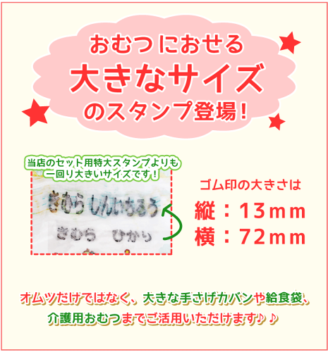 名前書きの決定版! 万能スタンプセット【キッズネーム】より、おむつセットをご用意いたしました! 赤ちゃんから介護用、大きなサイズのものにもご利用いただけます。