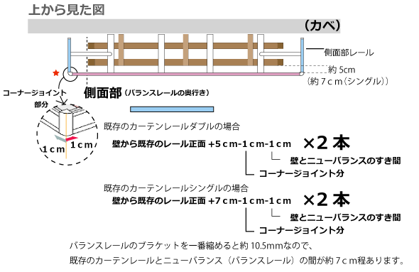 バランスレール全体の長さ(2.37m) 237cm=側面部×2+正面部 ※壁とニューバランスのすき間を1cm空けるのは 上飾りがよれない為ですが、重みがある場合は壁に付けた方が垂れにくいです。
